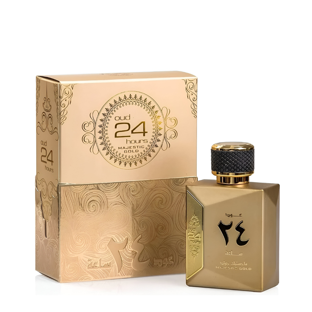 OUD 24 Hours Majestic Gold is a unisex, long-lasting Arabian EDP with a rich blend of oud, floral, and fruity notes, creating a luxurious and sophisticated scent.